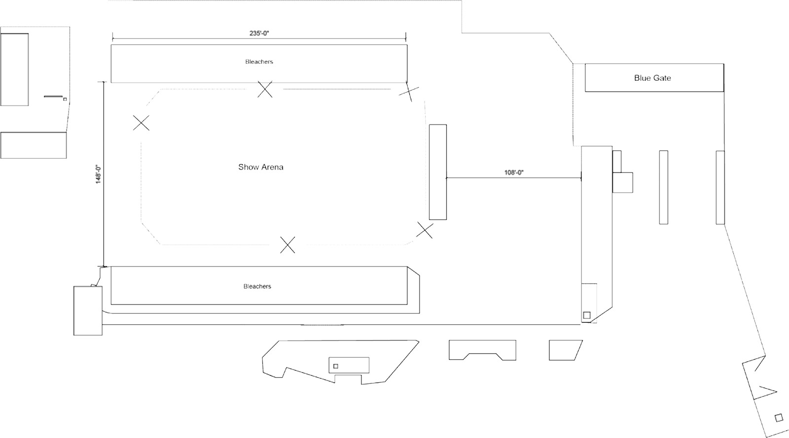Measures 120’ W by 260’ L and can seat up to 3,500 comfortably for rodeos, monster truck shows, concerts, dances and other unique performances. Bleacher seating lines both sides of the arena. Restrooms located just outside arena as well as entrance/exit gate access.